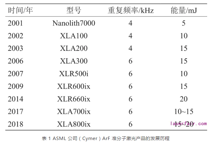 針對光刻應用需求,國際上主要有荷蘭 ASML 公司(Cymer)和日本 Gigaphoton 公司提供相應的準分子激光產品,相應功率從 10~100 W、光譜線寬從 0.5~0.1 pm、重復頻率從 2~6 kHz。高重復頻率可以提高加工產率,窄線寬可以保證芯片圖案的精細度,減小系統中色差影響,因此,高重頻和窄線寬是光刻用準分子激光光源發展不斷追求的指標。表 1 為 ASML 公司(Cymer)ArF 準分子激光產品的發展歷程。