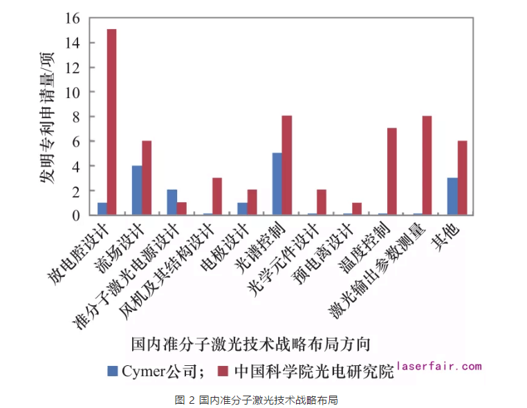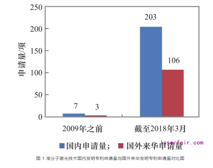 從 2009 年起,在國家科技重大專項(02 專項)的支持下,我國準分子激光技術獲得迅速發展,中國科學院光電研究院、上海光學精密機構研究所、長春光學精密機械與物理研究所、合肥物質科學研究院、光電技術研究所、上海微電子裝備有限公司、華中科技大學等單位參與了相關項目研發工作。目前,已攻克了一系列高性能準分子激光核心關鍵技術,實現了高重頻(kHz)、大能量(mJ 級)、窄線寬(亞 pm)準分子激光的穩定運轉,研發出第一代光刻用準分子系統原理樣機,目前正在進行技術提升和面向產品的開發,并初步建立了我國自主的知識產權體系。圖 1 為目前統計的準分子激光技術國內發明專利申請量與國外來華發明專利申請量對比?梢,在 2009 年之前,國內申請和國外來華申請量僅分別為 7 項和 3 項;在 2009 年之后,截至 2018 年 3 月,相關數據已分別激增至 203 項和106 項。國內準分子激光技術戰略布局如圖 2 所示,主要分布在放電腔設計、流場設計、準分子激光電源設計、電極設計、光譜控制、光學元件設計、預電離設計等方面。