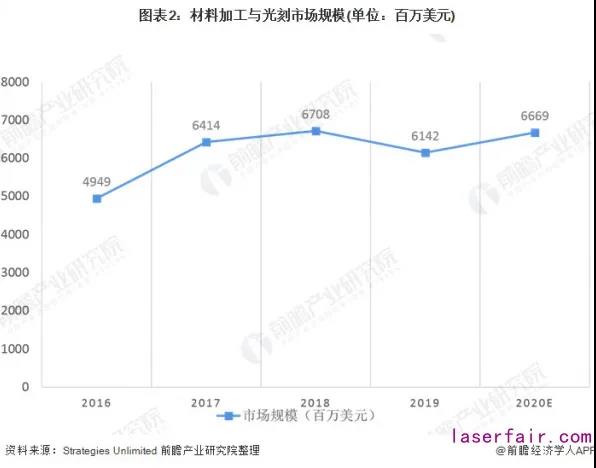 2019年中國激光器在國際市場的競爭力進一步增強,曾經中國生產的光纖激光器大多局限在打標應用的級別,但近幾年隨著中國激光器產商技術的進步,中國公司能夠提供更高功率的激光產品,導致光纖激光器價格急劇下降。另一方面,美國的貿易關稅政策對激光貿易產生了巨大的不利影響,可以看出,2019年材料加工與光刻的市場規模有所下降。