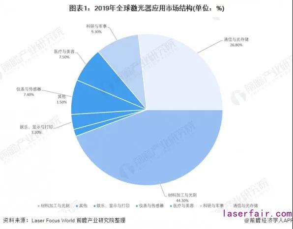 2019年全球激光器應用領域中,材料加工與光刻、通信與存儲仍然是全球激光主要應用市場,分別占比44.3%及26.8%;其余應用領域中科研與軍事占比9.3%,醫療與美容市場占比7.5%,儀器與傳感器占比7.4%,娛樂、顯示及打印市場占比3.2%。