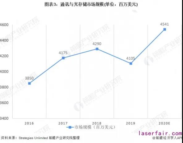 根據Strategies Unlimited的數據,2019年通訊與光存儲市場規模為4105百萬美元,同比下降4.3%。通信市場的激光器收入受到行業周期的影響,幾乎與全球范圍內新的、大規模的通信網絡部署同步。2017年和2018年,大多數4G蜂窩網絡的部署已經完成,5G網絡剛剛開始部署,需求并未完全釋放,隨著2020年5G網絡的逐步開展,需求將得到釋放,通訊市場的規模預計將有所回升。