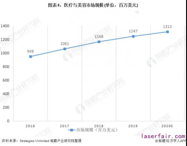 醫療與美容市場在在經過連續幾年超過10%的增長后,2019年的增長有所放緩,實現6.7%的增長。醫療與美容市場的收入主要來自四個細分市場:美容、眼科、牙科、外科。收入增長的驅動因素主要來自亞洲的中產階級,而隨著歐亞地區的經濟增長放緩,這部分人群在這四個細分市場的消費增長也將放緩,預計未來醫療與美容市場規模增長將放緩。