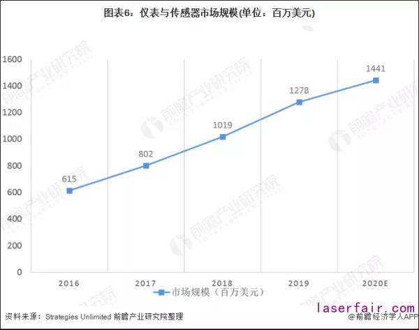 2019年儀表與傳感器市場規模為1441百萬美元,同比增長12.75%,儀表與傳感器在激光市場中雖應用范圍不是很大,但卻具有比較好的增長潛力,其細分市場具有較多正在快速增長的領域,如激光雷達、垂直腔面發射激光器(VCSEL)、邊緣發射激光二極管和3D 傳感。