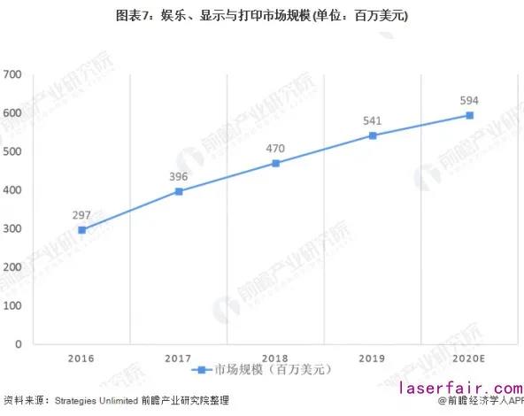 娛樂、顯示與打印市場規模相對較小,僅占全球激光器總市場規模的3.2%,但在2016-2019年中一直保持增長的態勢。2020年隨著中國激光影院數量的增加以及用于電視機和投影儀激光器的增長,會對娛樂、顯示與打印市場的增長產生有利影響。